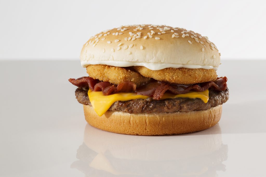 PÃO BRIOCHE, BURGUER, QUEIJO CHEDDAR, ONION RINGS, MAIONESE E MOLHO BARBECUE